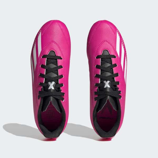 נעלי כדורגל אדידס ילדים מדגם ADIDAS X SPEEDPORTAL.4 FxG J בצבע ורוד ושלושה פסי אייקון לבנים עם שרוכים שחורים לקשירה